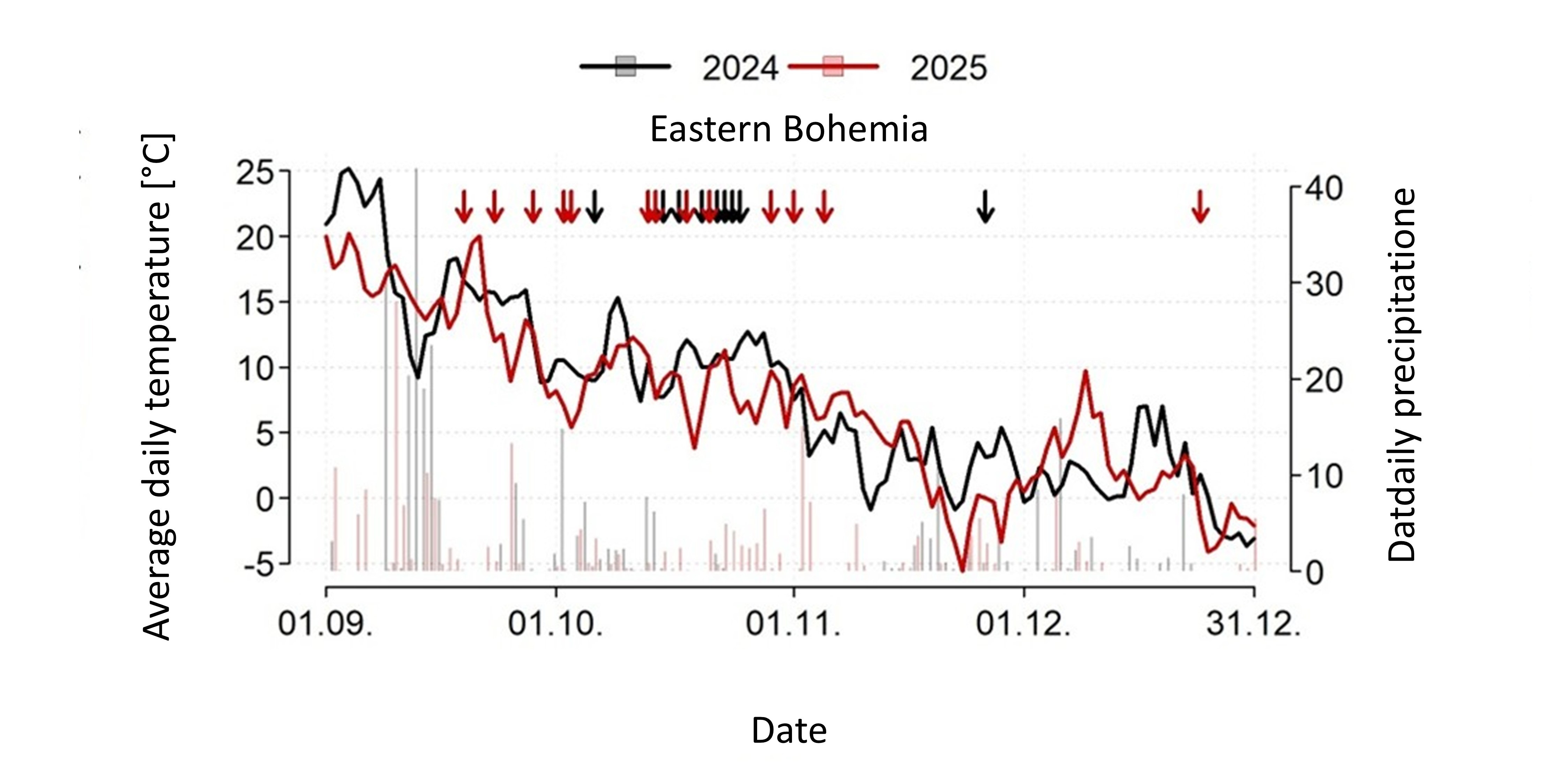Figure 2: Course of temperatures (lines) and precipitation (bars) in eastern Bohemia during autumn and the beginning of winter in the two years being compared. Arrows, color-coded by year, indicate the departure dates of individual lapwings.