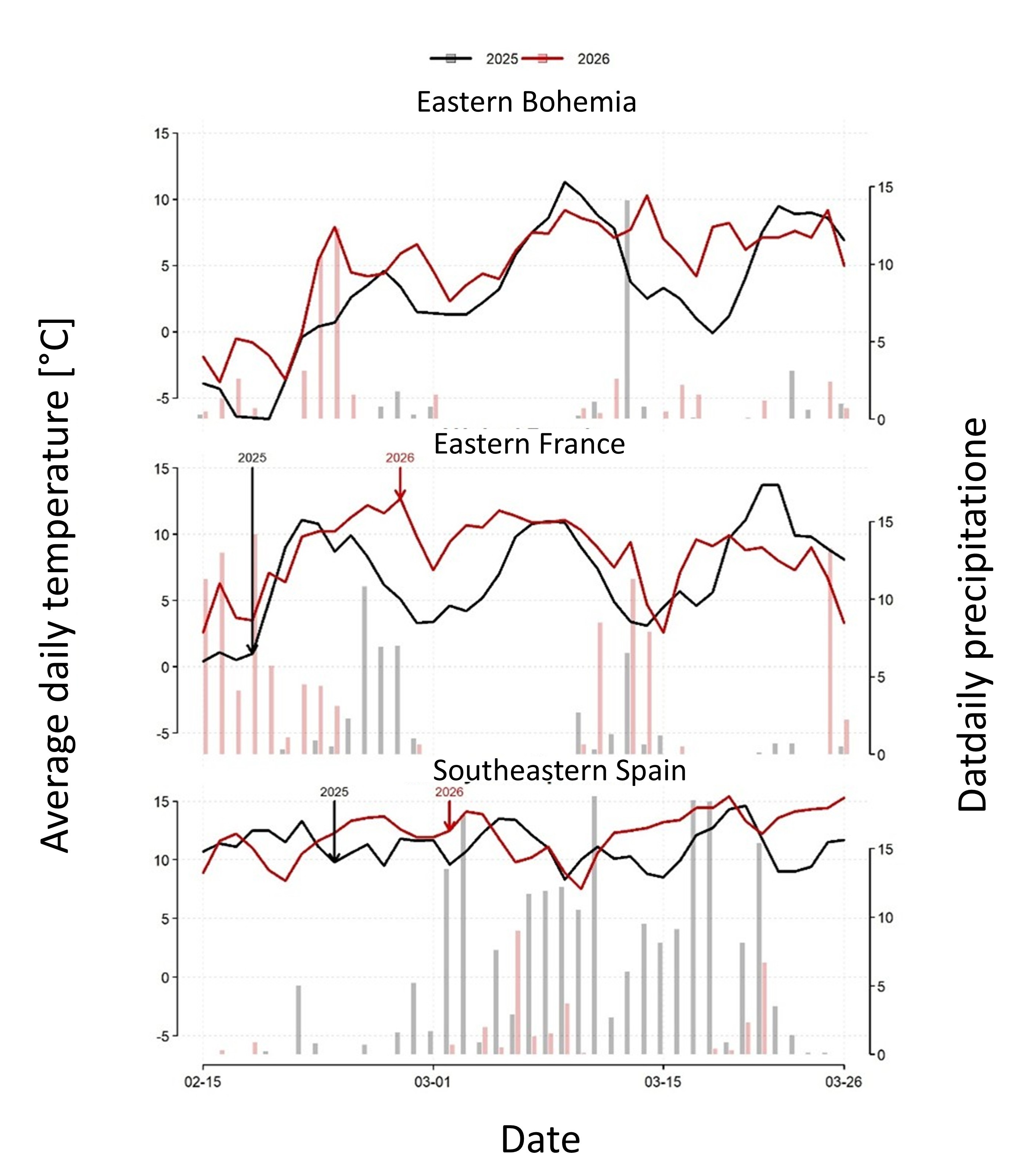 Figure 3: Course of temperatures (lines) and precipitation (bars) at the breeding site in eastern Bohemia, and at the wintering grounds in France and Spain during spring return from the wintering grounds in the two years being compared. Arrows, color-coded by year, indicate the median departure dates from the given wintering ground in each year.