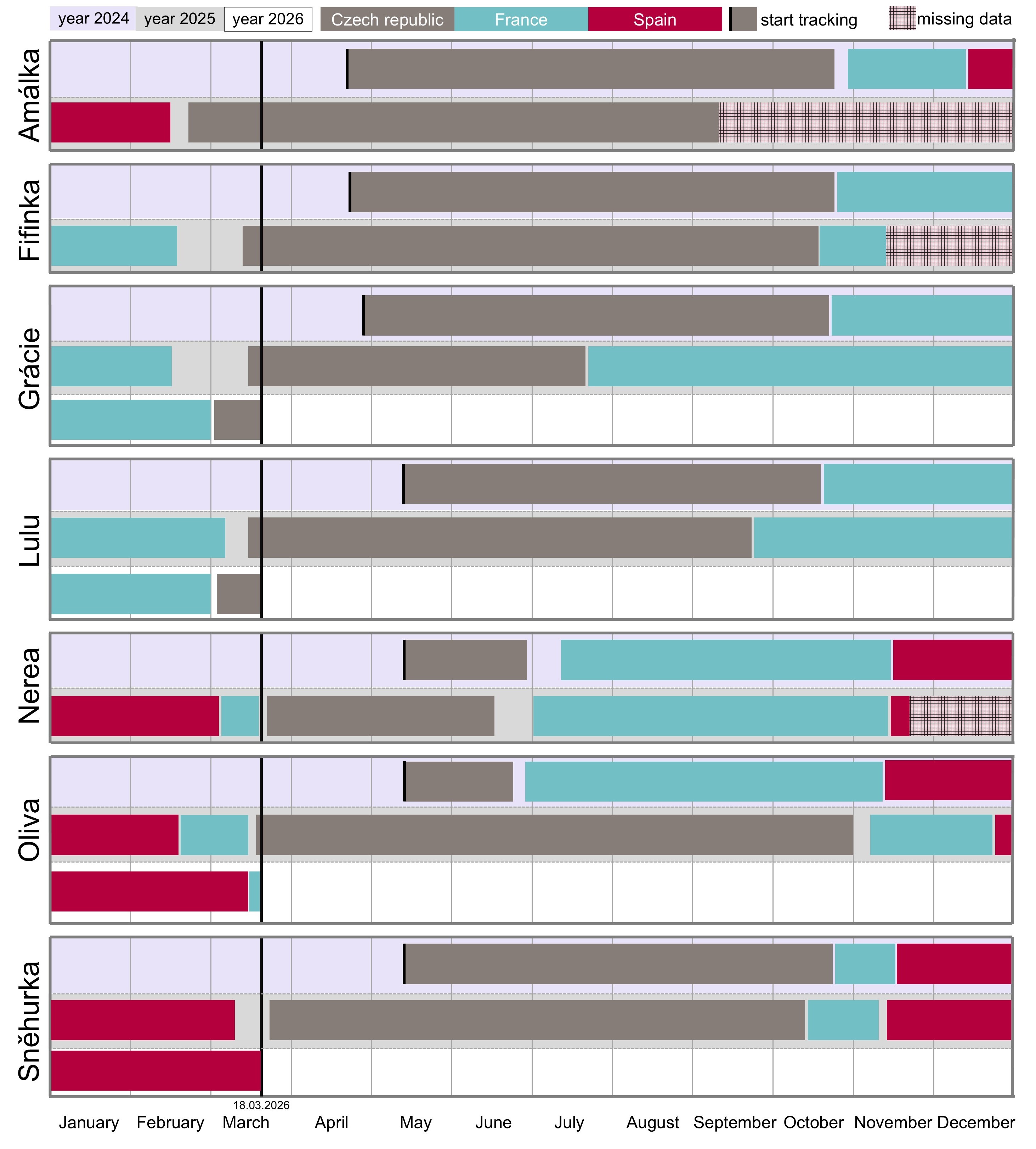 This dataset does not provide an entirely clear answer as to whether the timing of autumn migration is individually specific. A logical hypothesis suggests itself, however: could the timing be related to a lapwing’s success in the breeding season? In other words, are those that leave only in autumn the ones that managed, at the last moment, to hatch young and raise them to fledging? It is probably not that simple. For example, Grácie left only in autumn in 2024 even though she had lost her last nest on May 25, whereas in 2025 she departed already with the summer wave even though she was still caring for young in early July. Very probably, then, changes in the timing of departure are determined rather by the current condition of the breeding site, the timing of harvest, and other factors.