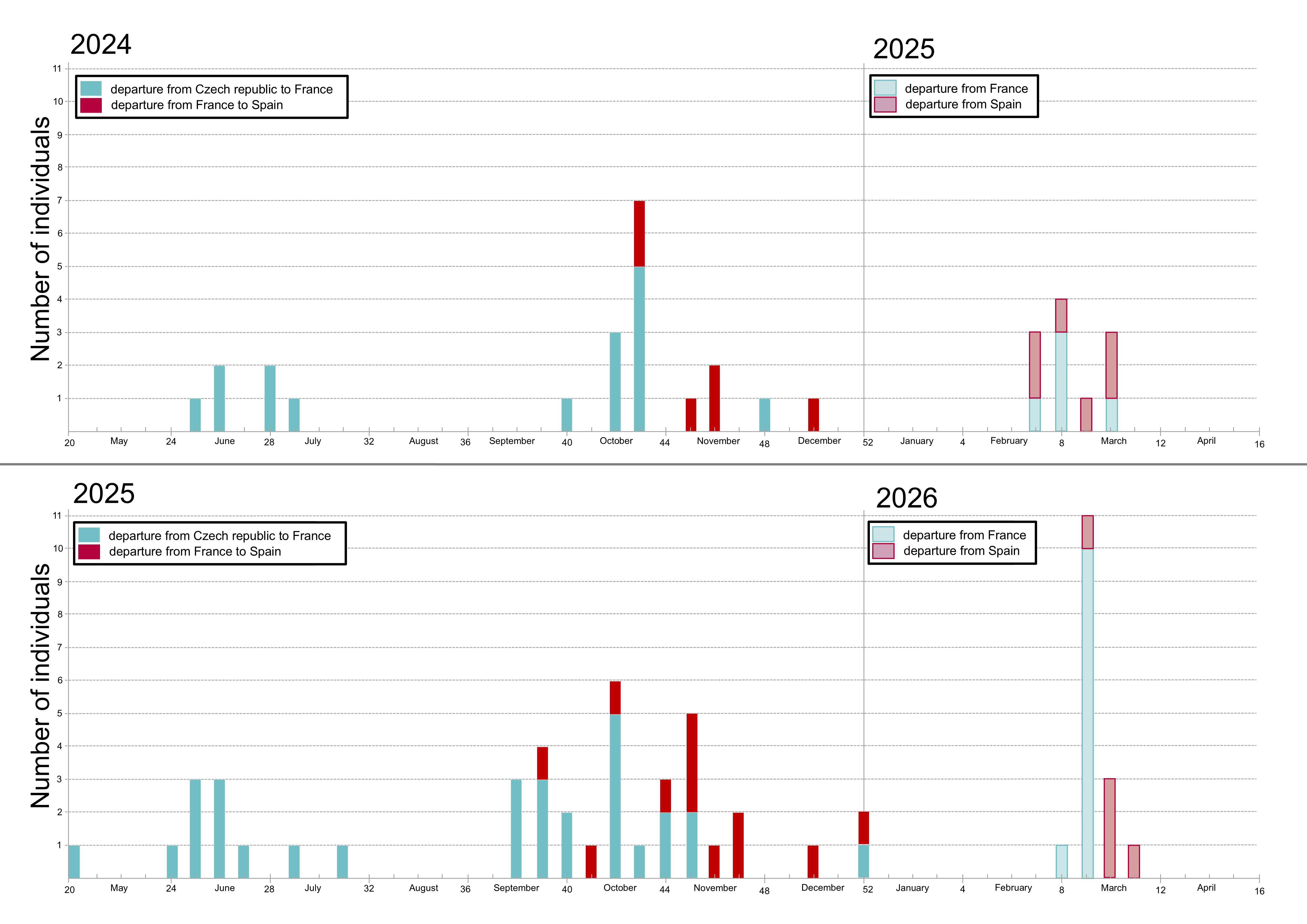 Now let us consider whether the timing and course of migration are a matter of individual preference, or rather of the immediate situation in which a lapwing finds itself. We managed to record the timing of departures in two seasons for six - or perhaps seven - lapwings (see Fig. 4). That “perhaps seven” is because of Amálka. Her transmitter fell silent in September 2025, so we do not know the exact date of her second departure; we only know that (as in 2024) she did not leave with the first wave. Of these seven repeatedly tracked lapwings, four departed in the autumn wave in both years, Nerea always with the summer wave, and Gracie and Oliva swapped departure waves between seasons.
